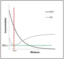 The Streeter–Phelps equation determines the relation between the dissolved oxygen concentration and the biological oxygen demand over time and is a solution to the linear first order differential equation[1]