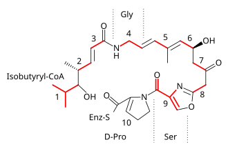 - ^ Kingston, D.; Kolpak, M.; LeFevre, J.; Borup-Grochtman, I. (1983). "Biosynthesis of Antibiotics of the Virginiamycin Family. 3. Biosynthesis of Virginiamycin M1". J. Am. Chem. Soc. 105 (15): 5106–5110. doi:10.1021/ja00353a041.