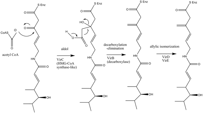 The streptogramin A PKS-NRPS is composed of 6 proteins: VirA contains modules 1 though 6; VirF, VirG, and VirH contain modules 6 through 10; VirI is the AT domain that acts for every PKS module; and VirJ contains the TE domain. The starter unit for the biosynthesis of streptogramin A is isobutyryl-CoA, which is given by the amino acid valine after it has undergone transamination and branched-chain keto acid dehydrogenation. Two rounds of chain extension with malonate follow. An NRPS module introduces a glycine residue into the growing polyketide chain, followed by two more rounds of chain extension with malonate. At this point, four enzymes use acetyl-CoA to add a methyl group to position 12 on the macromolecule. The mechanism of the reaction is proposed below. VirC and HMG-CoA synthase bear striking structural similarities and while the mechanism for VirC is not known, it can be proposed to be similar to that of HMG-CoA synthase.[3]
