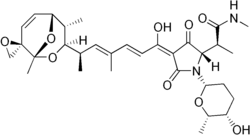 Streptolydigin (Stl) is an antibiotic that works by inhibiting nucleic acid chain elongation by binding to RNA polymerase, thus inhibiting RNA synthesis inside a cell.[1][2][3] Streptolydigin inhibits bacterial RNA polymerase, but not eukaryotic RNA polymerase.[4] It has antibacterial activity against a number of Gram positive bacteria.
