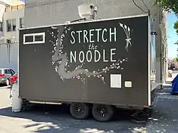 Stretch the Noodle, most known for serving Chinese-style hand-stretched noodles, operates from a food cart in downtown Portland's Midtown Beer Garden,[2] and previously elsewhere near the Morrison Bridge.[3] In 2018, Andrea Damewood of the Portland Mercury described Stretch the Noodle as an "unassuming cart with a chalkboard menu and a small speaker playing tinny Chinese music on Southwest Washington".[4] The pale yellow food cart has hand-pulled noodle illustrations on the side.[5]