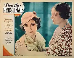 Strictly Personal is a 1933 American pre-Code drama film directed by Ralph Murphy, written by Beatrice Banyard, Willard Mack, Wilson Mizner, Casey Robinson and Robert T. Shannon, and starring Marjorie Rambeau, Dorothy Jordan, Eddie Quillan, Edward Ellis, Louis Calhern, Dorothy Burgess and Rollo Lloyd. It was released on March 17, 1933, by Paramount Pictures.[1][2]