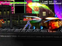 While the graphics in Strider 2 now consist of 2D character sprites overlaid over 3D backgrounds, its gameplay remains similar to its 2D side-scrolling predecessor. The controls consists of an eight-way joystick and three action buttons. The playable character Strider Hiryu can now perform new actions in addition to the ones he had in the first game. Hiryu can walk, jump, crouch, slide, and climb walls and ceilings like he would in the original game, as well as dash by pushing the joystick left or right twice, do a double jump by pressing jump in mid-air, and do a backward somersault jump while sliding. When climbing a wall, Hiryu can perform a thrust jump by holding the joystick away from the wall and pressing the Jump button. Added to his regular sword attack, Hiryu can now do a "Savage Slash" technique in mid-air by pressing the joystick down and up in mid-air. In addition to the Attack and Jump buttons, the player can power-up their character by pressing the "Boost" button if they have at least one Boost item in stock. While in Boost mode, Hiryu can shoot Plasma Waves with his sword for a limited period until the Boost gauge under Hiryu's life gauge runs out. Throughout the game, the player can pick up power-up items such as health replenishments and extensions, a cypher extension, and additional boosts. The player can obtain various miscellaneous point items based on other Capcom games, such as the Yashichi and the Sakichi symbols from Vulgus and the "zenny" coins from Black Tiger and Forgotten Worlds, that will increase the player's score.[4]