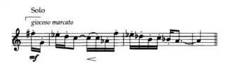 The fourth is the most widely discussed movement out of the whole piece. It is organized according to a pre-composed numerical plan, where the theme is subjected to a series of transformations.[6] Crawford's favorite serial operations involve systematic permutation and transpositions, which can be heard in this movement.[8] The first violin's unrestrained melody is played against a strictly serialized melody played by the other three instruments. In some analyses, the orderly-patterned serial voice is regarded as more "rational" and "masculine", while the first violin's individuality is more "assertive" and "feminine".[7]
