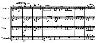 The entire Adagio is an elaborate preparation of the dominant chord which Mozart emphasizes with a fermata in its final measure.[7] When the Allegro begins, the cello is silent, and the viola has taken up its eighth note Cs, playing them an octave higher and much more ebulliently than the opening bars.[8]: 700