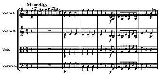 The third movement is a minuet and trio in C major. The A is often ornamented with an appoggiatura G♯, continuing Mozart's interplay between these two notes. In the trio, the tonality shifts to C minor, returning the A♭ to the fore. The cello's concluding melody in the trio highlights the vacillations between these notes.[6]: 291 The texture is mercurial with unison passages often signaling a shift.[10]: 58