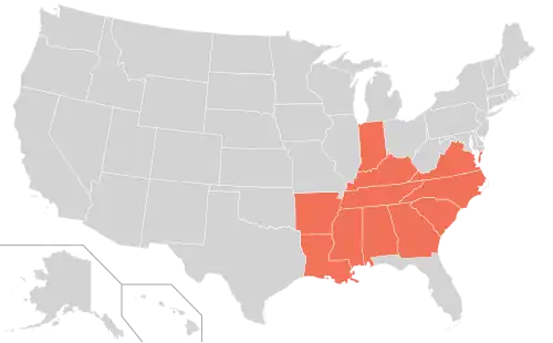 The Stroke Belt is typically defined to include the states of Alabama, Arkansas, Georgia, Indiana, Kentucky, Louisiana, Mississippi, North Carolina, South Carolina, Tennessee, and Virginia.[2] In 1980, these 11 states had age-adjusted stroke mortality rates more than 10% above the national average.[3]