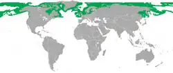 Strongylocentrotus droebachiensis is commonly known as the green sea urchin because of its characteristic green color, not to be confused with Psammechinus miliaris as it is also commonly called the green sea urchin. It is commonly found in northern waters all around the world including both the Pacific and Atlantic Oceans to a northerly latitude of 81 degrees and as far south as Maine[1] (in the U.S.) and England. The average adult size is around 50 mm (2 in), but it has been recorded at a diameter of 87 mm (3.4 in). The green sea urchin prefers to eat seaweeds but will eat other organisms. They are eaten by a variety of predators, including sea stars, crabs, large fish, mammals, birds, and humans. The species name "droebachiensis" is derived from the name of the town Drøbak in Norway.[2]