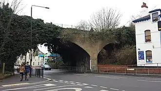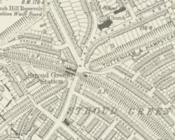 Stroud Green railway station is a former station in the Stroud Green area of north London. It was located between Finsbury Park station and Crouch End station on a bridge over Stapleton Hall Road. The station had platforms (now demolished) cantilevered from the bridge structure and a wooden station building (also now demolished) at ground level under and on either side of the bridge, with a station master's house to the north of it. The bridge still exists and now carries the Parkland Walk cycle and pedestrian path, whilst the station master's house serves as a community centre.[1][2]