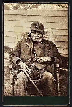 As an elder, he walked with a cane, and the congregation would respectfully wait for the old chief to enter the church and take his place in the "bishop's chair" before commencing with services. He died in 1888.