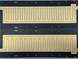 The two mirrored halves of a SLIM system are shown in the example to the left. Compared to the longer pathlength systems developed at PNNL, this board is considerably shorter but serves as a rapid prototype.[6] When folded together and spaced ~3 mm apart, the co-planar electrode surfaces create the fields needed for ion confinement and separation.