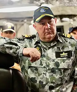 On Mayer's return to Australia in April 2010, he assumed duties as Commodore Flotillas at Fleet Headquarters.[2] Promoted to rear admiral, he was appointed Commander Australian Fleet on 12 June 2014.[7] In recognition of his "selfless devotion to duty and outstanding achievement" in these senior roles, Mayer was made an Officer of the Order of Australia in the 2017 Australia Day Honours.[8] He relinquished command of the Australian Fleet to Rear Admiral Jonathan Mead in January 2018 and was appointed as Head Force Design within the Vice Chief of Defence Force Group from March.[9]