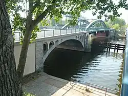 In addition to the historic Stubenrauchbrücke, which has been a listed building since the 1980s,[8] the Berlin Senate, which has been responsible for all of Berlin since the fall of the Wall, had a parallel reinforced concrete beam bridge built 20 meters downstream from the Spree in the early 1990s, which served as a makeshift construction for traffic between Ober- and Niederschöneweide. However, in 1994, both bridges had to be closed to truck traffic. Between 1998 and 1999, extensive repairs were carried out on the Stubenrauch Bridge. These renovations were funded by the Joint Task for Improvement of the Regional Economic Structure and the European Regional Development Fund, with a total cost of 12.5 million marks (equivalent to about 9.5 million euros in today's currency).[9] Engineers from the firm Gregull + Spang were responsible for the project, which included reinforcing the metal structure by installing an orthotropic deck and replacing corroded metal components of the main opening.[10] On the south side of the bridge, a new concrete arch was added to match the design of the northern bridge arch, based on historical plans. Additionally, several historic-style streetlights were installed in the middle section of the bridge.[11]