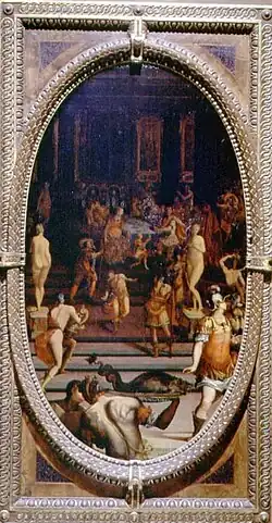 The walls were also covered with 34 paintings representing mythologic or religious subjects, or representing trades. The arrangement was such that paintings were somehow related to their neighbors, and emblematic of the objects in the cabinets below. The arrangement we see today is somewhat speculative; and the relationships are not always clear. For example, Tommaso d'Antonio Manzuoli's Diamond Mines hangs above Maso de Sanfriano's Fall of Icarus. The painting by Giovanni Battista Naldini of the House of the Dreams emphasized the relationship with the adjacent bedroom of the Prince. In addition, originally a portrait of Francesco's mother, Eleonora of Toledo by Bronzino, kept vigil.[1]