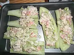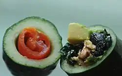 American cookbooks from the early 20th century described many different fillings for stuffed cucumber, including French dressing, mayonnaise, tomatoes, walnuts, celery, onions, and lobster. After being hollowed out with a specialized tool, the filling is piped into the cucumber.[3] Some versions and breaded and fried before being served whole, or sliced to serve as a garnish for another dish.[4] While some are stuffed with Greek yogurt/ hung curd and served as a summer salad/starter. Others are stewed or baked in gravy.[5] At state fairs in the United States in the 2010s, stuffed cucumbers were marketed as a "healthier alternative" to deep fried or chocolate covered fair food. [6][7]