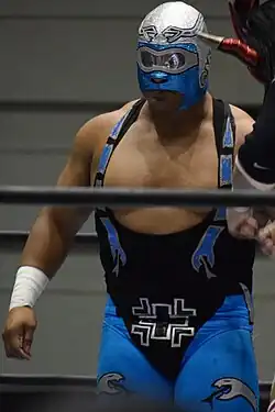 In late March 2013, Stuka Jr. was announced as a participant in the 2013 En Busca de un Ídolo ("In search of an Idol") tournament that took place from May to July 2013 as one of eight competitors.[31] From January 14 to 19, 2014, Stuka Jr. worked the New Japan Pro-Wrestling (NJPW) and CMLL co-produced Fantastica Mania 2014 tour, which marked his debut in Japan. For the entire tour, Stuka Jr. worked undercard matches alongside Rey Cometa.[32][33] On April 27, Stuka Jr. won the 2014 Reyes del Aire tournament, outlasting a field that included Averno, Mephisto, Ephesto, Mr. Niebla, Valiente, Tritón, Delta, Guerrero Maya Jr., Rey Cometa, Niebla Roja, Puma, and Tiger.[34][35] In January 2015, Stuka Jr. returned to Japan to take part in the Fantastica Mania 2015 tour, during which he unsuccessfully challenged Mephisto for the Mexican National Light Heavyweight Championship.[36] Stuka Jr. would go on to unsuccessfully challenge Mephisto for a championship on two further occasions, on July 5, 2015, and August 7, 2017.[37][38] Stuka Jr. and various partners would also unsuccessfully challenge Mephisto, Ephesto, and Luciferno for the Mexican National Trios Championship on four occasions between 2015 and 2016.[39][40][41][42]