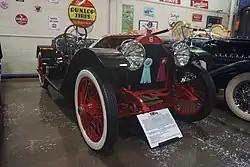 The original production Bearcat was introduced in the Series A of 1912. The first public mention of the car (then spelled "Bear Cat" ) is in an advertisement in the 1912 program for the Indianapolis 500 mile race. This ad also was the first to use the soon to be famous Stutz slogan "The Car that made good in a day" referring to the Stutz racer's 11th-place finish in the 1911 Indianapolis 500. The Series E of 1913 brought electric lights and starter. A six-cylinder option was available for an extra $250.00 (equivalent to $7,954 in 2024[1]). The doorless body style lasted through 1916. A sales catalog lists the available colors for the Series E as vermillion, monitor gray, and Mercedes red. Wire wheels were listed as a $125 option (equivalent to $3,612 in 2024[1]).