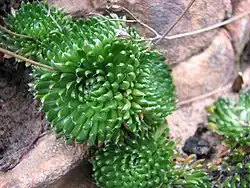Stylidium soboliferum, commonly known as Grampians triggerplant or bristly triggerplant, is a species of flowering plant in the family Stylidiaceae. It is endemic to the Grampians region in Victoria, Australia. The leaves are about 1–2 centimetres (0.39–0.79 in) long and are arranged in a small rosette. The flowers, which appear on 5–15 centimetres (2.0–5.9 in) long stems, have white to pale pink petals with a darker colour on the reverse side. Plants occur along drainage lines and in moist areas amongst rocks.[2]