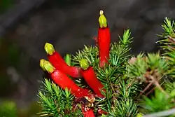 Styphelia is a genus of shrubs in the family Ericaceae, native from Indo-China through the Pacific to Australia.[2] Most have minute or small leaves with a sharp tip, single, tube-shaped flowers arranged in leaf axils and with the ends of the petals rolled back with hairs in the inside of the tube.