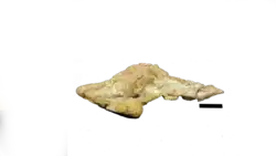 Although multiple Styracocephalus skulls have been recovered, there has yet to be a specimen found of the entire therapsid skeleton. A majority of the skulls collected have also been mature skulls, as the juvenile tapinocephalid skulls are identified by having a small non-fused basioccipital.[3] The presence of enlarged canines, pachyostotic cranial boss, and horns are all plesiomorphic traits found in Dinocephalia.[2] Styracocephalus's head ornament meant that it could be recognised from a distance. One of the most striking feature of Styracocephalus is the large backward-protruding tabular horns.[4] It was around 1.8 metres (5 ft 11 in) in length,[5] with a 42-centimetre-long (17 in), 29-centimetre-wide (11 in) skull.[4]
