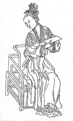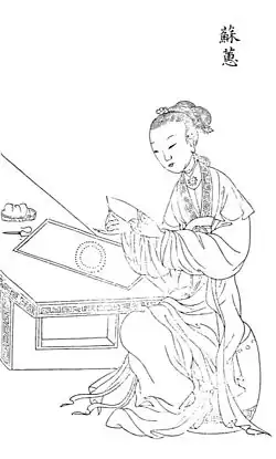 Su Hui (simplified Chinese: 苏蕙; traditional Chinese: 蘇蕙; pinyin: Sū Huì, fourth century CE) was a Chinese poet of the Middle Sixteen Kingdoms period (304 to 439) during the Six Dynasties period. Her courtesy name is Ruolan (traditional Chinese: 若蘭; simplified Chinese: 若兰; pinyin: Ruòlán). Su is famous for her extremely complex palindrome poem (huiwen 回文), apparently having innovated this genre, as well as producing the most complex example to date.[1] Su Hui is depicted in the Wu Shuang Pu (無雙譜, Table of Peerless Heroes) by Jin Guliang.