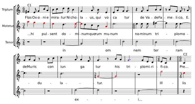 The metric and rhythmic relations between the three voices are quite complex. The triplum moves in tempus imperfectum cum prolatione maiore (6/8 time) throughout, no matter what the current meter of the tenor is; this results in complex patterns of overlap and syncopation. The motetus is even more complex, as it shifts between meters multiple times. This is indicated in the notation by frequent use of colaration, the use of note heads filled in in red to indicate that their temporal value is shortened to two thirds their nominal value.