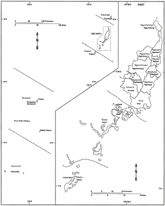 - ^ Patterson, Carolyn Bennett, et al. "At the Birth of Nations: In the Far Pacific." National Geographic Magazine, October 1986 page 493. National Geographic Virtual Library, Accessed 17 May 2018. "The westernmost among the emerging nations of the Pacific, the Republic of Palau (or Belau), population more than 15,000, is divided into 16 separate states, each with its own governor, lieutenant governor, and legislature. Most state populations are very small, and one wonders if anyone has time for anything but government, American style and democratic though it may be.
