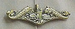 In 1941 the Uniform Regulations were modified to permit officers and enlisted men to wear the submarine insignia after they had been assigned to other duties in the naval service, unless such right had been revoked.[27] The officer insignia was a bronze gold-plated metal pin, worn centered above the left breast pocket and above the ribbons or medals. Enlisted men wore an embroidered silk insignia on the outside of the right sleeve, midway between the wrist and elbow until 1947 when it was shifted to above the left breast pocket. In 1943 the Uniform Regulations were modified to allow enlisted men, who were qualified for submarine duty then subsequently promoted to commissioned or warrant ranks, to continue wearing the enlisted submarine insignia until they qualified as submarine officers when they were entitled to wear the officers submarine pin. A 1950 change to Uniform Regulations authorized the embroidered insignia for officers (in addition to pin-on insignia) and a bronze, silver-plated, pin-on insignia for enlisted men (in addition to the embroidered device).[27]