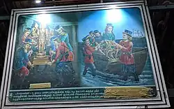 The Murugan temple at Tiruchendur was occupied by the Dutch East India Company from 1646 to 1648, during the course of their war with the Portuguese. The local people tried to free their temple, with no success. The Dutch finally vacated the temple on orders from the Naik ruler. However, while leaving, they removed the sculpture depicting the 2 utsava murtis (this representation of the deities comes out only during Masi and Avani Tirunal) which is made of an alloy named Shanmukhar and took it with them. During their sea voyage, they encountered a strong storm and realised their mistake of stealing the murti. They dropped it in the middle of the sea and saw the storm stop immediately. According to legend, Murugan appeared in a dream to Vadamaliyappa Pillai, an ardent devotee of Murugan, and revealed the place in the sea where the idol had been abandoned. Vadamlaiyappa Pillai in the Tiruchendur temple, went to the spot in a fishing boat and retrieved the murti in 1653. The story is shown in paintings inside the temple.[8]
