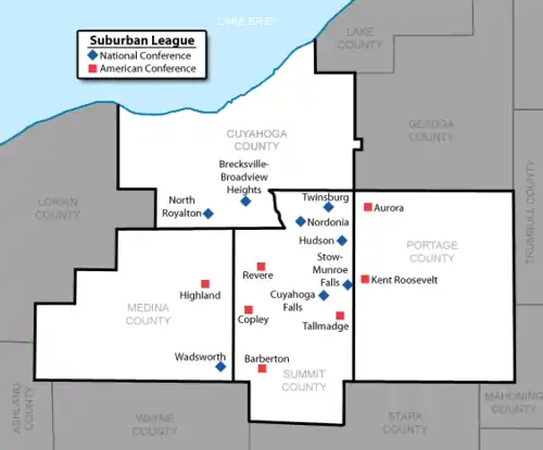Cloverleaf departed for the PTC and Green to the Federal League after the 2014–15 season. Beginning in the 2015–16 season, nine new schools began Suburban League play along with the remaining six schools, with Barberton, Hudson, and Twinsburg returning to the league, and Aurora, Brecksville–Broadview Heights, Cuyahoga Falls, Kent Roosevelt, North Royalton, and Stow–Munroe Falls joining the league. With the influx of new members, membership rose to 15 schools and was divided into two conferences based on enrollment, with the eight larger schools in the National Conference and the seven smaller schools in the American Conference.[12] In 2019, the league announced that beginning in 2021, Cuyahoga Falls would move to the American Conference, in spite of Cuyahoga Falls having one of the largest enrollments in the league. The switch was requested by Cuyahoga Falls in hopes of being more competitive.[13][14]