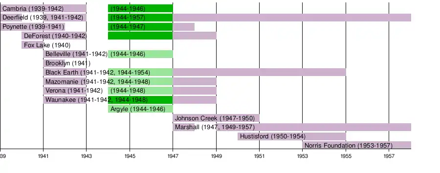 The Suburban Six-Man Football League was formed in 1939 as the Dane-Columbia Six-Man Football League by three small high schools in south central Wisconsin.[1] All three schools played six-man football and belonged to conferences which either did not sponsor the sport (Cambria and Poynette of the Dual County Conference) or sponsored eleven-man football (Deerfield of the Madison Suburban Conference). Deerfield left for the 1940 football season to compete as an independent, with DeForest and Fox Lake taking their place in the newly renamed South Central Four.[2] It wasn't until the 1941 football season that the conference would adopt the Suburban Six-Man Football League moniker.[3] That season, membership increased from four to ten schools. Along with Deerfield's reentry into the conference, the Suburban Six-Man Football League accepted three members associated with the Tri-County League (Black Earth, Mazomanie and Waunakee), two from the State Line League (Belleville and Brooklyn) and Verona of the Madison Suburban Conference.[4] Brooklyn left the conference in 1942[5] when they dropped football from their interscholastic athletic offerings, which along with Poynette's exit reduced membership to eight schools.[6] Competition in the Suburban Six-Man Football League was suspended for the 1943 season amid gasoline rationing for the World War II effort.