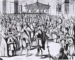 The death of the Cardinal of Bourbon prompted measures to elect a new anti-king. Although the French monarchy was hereditary, the League's lawyers searched the early history of France for precedents to legitimise the election of a king.[9] The Protestant scholar and ideologue François Hotman had argued in his Francogallia that France was once a free country, whose liberties had been eroded over time, including the right to elect kings.[10] Hotman had asserted the right of the Estates-General to perform this function. Though Hotman was a Protestant, his argument also influenced Catholic jurists searching for a means to replace the Cardinal of Bourbon at the beginning of the 1590s and the decision to summon the Estates-General to elect a new "king".[11]