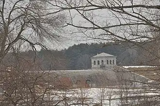 A storehouse, located just northeast of the dam, was built in 1900 to house wooden stop planks used to regulate flow. This building was converted to house electrical equipment when the hydroelectric facility was built. Below the dam, to the northeast of the channel to Framingham Reservoir No. 3, is the head house for the Weston Aqueduct. Built in 1903, it was designed by Shepley, Rutan and Coolidge to harmonize with the existing gate house. Adjacent to this head house is the head house for Shaft #4 of the Hultman Aqueduct, built 1939–40. The Hultman Aqueduct is a high-pressure underground aqueduct carrying water from Wachusett Reservoir to staging facilities closer to Boston, acting as a secondary system since 2003 to the MetroWest Water Supply Tunnel. This head house, also designed to harmonize with the previous buildings, was designed by Densmore, LeClear & Robbins, who also designed similar structures for the systems of the Quabbin Reservoir. There are also two modern buildings on the site (built in the 1970s) that are not architecturally sympathetic to the others, and a small cluster of 19th century farm buildings that were moved when the dam was built.[2]