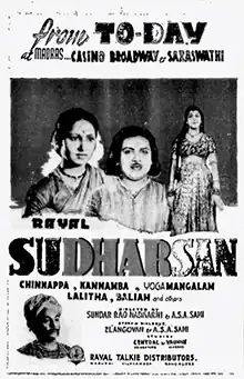 Sudharshan is a 1951 Indian Tamil-language film directed by A. S. A. Sami and Sundar Rao Nadkarni. The film stars P. U. Chinnappa and P. Kannamba. The story is based on a popular folk myth about a Panduranga devotee Gora who was a potter by trade. The same story was filmed simultaneously by Gemini Studios. The Gemini version Chakra Dhari was released early and due to an unknown reason Sudharshan was delayed.[1] It was released on 28 November 1951.[2]