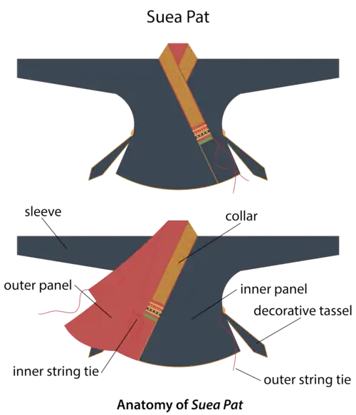 Basic components of the suea pat include a collar, front panels, back panels, sleeves, and tie strings. There are tassels at the side of the garment, though not always present. Modern versions typically of Lao design may use fasteners or buttons in lieu of strings. The collar can be done with intricate goldwork or be left plain. A cuff matching the collar is sometimes present and the sleeves can be full or three-quarters length.