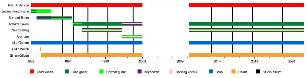 ![]() Suede performing at the Royal Albert Hall, March 2010 From left to right: Brett Anderson, Richard Oakes, Neil Codling, Mat Osman and Simon Gilbert. | |