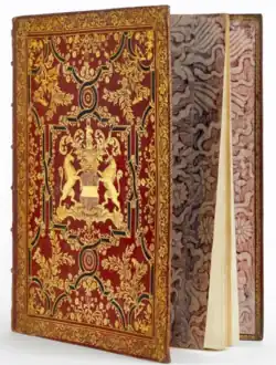Suenonius Mandelgreen was a bookbinder from Sweden. He was born in Uppsala and learned the trade of bookbinding in his native country, including stamping book covers in gold leaf. He then worked in Middelburg (Dutch Republic) from 1736 onwards, until his death in 1758.[1] Until the eighteenth century, it was customary for a publisher to only publish the book block. People could choose a bookbinder to provide it with a (luxury) binding of their choice, as happened with the illustrated copy of the Van Borssele van de Hooge family. The book block of this work was printed by Pieter Gillissen in Middelburg.[2]