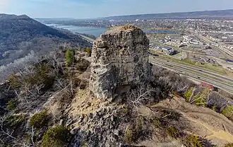 Sugar Loaf is a bluff on the Mississippi River topped by a rock pinnacle, overlooking the city of Winona, Minnesota, United States.[3] The name "Sugar Loaf" is sometimes taken to mean just the rock pinnacle, which was created by quarrying in the 19th century. The bluff stands above the junction of U.S. Route 61 and State Highway 43. It towers 500 feet (150 m) over Lake Winona (a former part of the Mississippi River's main channel), and the pinnacle rises more than 85 feet (26 m) above the remainder of the bluff.