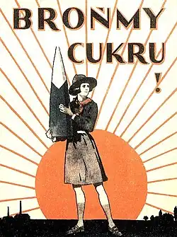 In 1930, the KPKC set up a new institution, Bureau of Propaganda for the Consumption of Sugar (Biuro Propagandy Konsumpcji Cukru, BKPC), to organise a more effective promotional campaign. The bureau was headed by Melchior Wańkowicz, a well-known publicist and propagandist at the time.[10] The BKPC's activities were aimed at improving the image of sugar in society and increasing its consumption. Learning from the BKPC's earlier failures, it focused on a wider range of activities, directing the campaign particularly to the Eastern Borderlands, where sugar was also popularised among the Ukrainian minority.[11] Despite the difficult economic situation associated with the Great Depression, the campaign was extensive and conducted with the cooperation of the Polish government.[12] New propaganda tools were introduced, including numerous posters and slogans.[13] The most well-known of these became the slogan Cukier krzepi ('Sugar strengthens [you]'), which quickly gained popularity.[14] Propaganda material was placed in the press,[15] on the radio[16] and on signs and billboards.[17] Slogans promoting sugar and stigmatising saccharin also appeared in Ukrainian, and the fight against saccharin continued as one of the main elements of the campaign.[18]