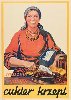 The main target audience for sugar propaganda in the 1930s was women, based on their role as the people responsible for preparing meals at home.[28] Propaganda campaigns produced numerous educational materials such as cooking instructions and guides, such as Co będzie na obiad ('What's for Lunch?') pamphlet, which portrayed sugar as an essential ingredient for tasty meals.[29] Advertisements emphasised that a meal without sugar loses flavour, and radio broadcasts promoted its benefits.[30] The campaign often referred to the nutritional value of sugar, comparing it with more expensive products such as lard, butter or meat, suggesting that sugar provides a similar amount of calories.[31] Women were also encouraged to use sugar as a means of improving children's health,[32] while men were persuaded that sugar gave them energy to work.[33] One of the popular promotional posters was the slogan Szczypta soli – szczypta cukru, emphasising its necessity in everyday life.[34]