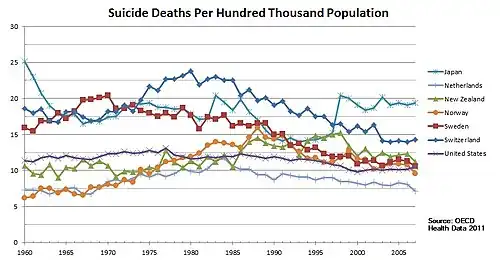 Sweden has a suicide rate which was below the OECD average.[1] During the 1960s, Sweden had one of the highest reported suicide rates among the most developed countries, but it declined as methods for measuring were standardized internationally.[2]