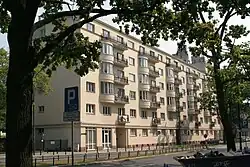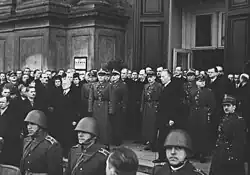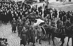 After his death, Sławek's body was displayed in his apartment until the funeral, where comrades, colleagues, and the public paid their respects.[9] The funeral took place on 5 April 1939 in Warsaw.[10] The procession, led by Canon Popławski, proceeded from the Field Cathedral of the Polish Army on Długa Street through Warsaw to the Powązki Military Cemetery. Rydz-Śmigły attended just before the service began. As the coffin was removed from the catafalque, Sławek's closest friends surrounded it, preventing Rydz-Śmigły's approach, blaming him for Sławek's death.[3] The coffin was carried by, among others, Aleksander Prystor, Janusz Jędrzejewicz, Michał Tadeusz Brzęk-Osiński, and Gen. Lucjan Żeligowski.[11] The funeral became a demonstration by Piłsudski loyalists against the Camp of National Unity. Wreaths included inscriptions such as: "To Walery Sławek – friends from PPS", "To a Friend of the Family – Aleksandra Piłsudska", and "To My Beloved Godfather – Jadwinia Piłsudska".[12]