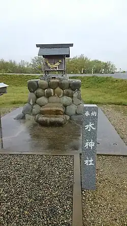 Suijin is widely worshipped at Suitengū Shrines throughout Japan through votive stone markers devoted to the Water God. Most of these stone markers can be found enshrined at dikes, agricultural irrigation canals, rice paddy fields, mountain springs, regular springs, streams, rivers, wells, household wells, and even inside sewage water and septic tanks. When a Suijin stone marker is enshrined at mountain springs that form sources for agricultural waterways, it is often labelled as "water distributing god" (kumari no kami 水分神), in which case it may also be associated with the god of the mountain (Yama no kami 山の神).[3]