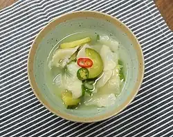 Sujebi[1] (수제비; South Korean name), ttŭdŏguk (뜨더국; North Korean name), or hand-pulled dough soup,[1] or Korean-style pasta soup, is a Korean traditional soup consisting of dough flakes roughly torn by hand, with various vegetables. The flavor and recipe resemble kalguksu, except that the latter is made with noodles rather than wheat flakes. It is commonly considered a dish to consume on rainy days, along with bindaetteok.