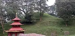 Over the next few years, he moved from place to place searching for the right capital, leaving behind his representative at each stage to rule the colonised land. Then he went up the Burhidihing river and established a province at Lakhen Telsa.[15] Then he came back down the river and established his rule at Tipam. In 1236 he moved to Mungklang (Abhoipur), and in 1240 down the Brahmaputra to Habung (Dhemaji). In 1244 he went further down to Ligirigaon (Song-Tak), a few miles from present-day Nazira, and in 1246 to Simaluguri (Tun Nyeu), a place downstream from the present-day Simaluguri.[16] Finally in 1253 he built himself his capital city at Charaideo near present-day Sibsagar town. The capital of the Ahom kingdom changed many times after this, but Charaideo remained the symbolic center of Ahom rule.