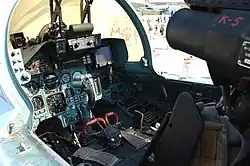 The Su-33 carries guided missiles such as the R-73 (four) and R-27E (six) on twelve hardpoints, supplemented by the 150-round 30 mm GSh-30-1.[21][27] It can carry an assortment of unguided rockets, bombs and cluster bombs for secondary air-to-ground missions.[21][27] The aircraft can be used in both night and day operations at sea. The radar used, "Slot Back", has been speculated to have poor multi-target tracking, making the Su-33 reliant on other radar platforms and airborne warning and control system (AWACS) aircraft like the Kamov Ka-31 early-warning helicopter.[23] The R-27EM missiles have the capability to intercept anti-ship missiles. The infra-red search and track (IRST) system is placed to provide better downward visibility.[22]