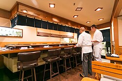 The restaurant has ten counter seats.[9] Jiro's son Takashi operates a two-star branch in Roppongi Hills in Minato, Tokyo.[10][11] The French chef Joël Robuchon said that the restaurant was one of his favorites in the world, and that it taught him that sushi is an art.[12] Sukiyabashi Jiro was the subject of the 2011 documentary Jiro Dreams of Sushi.[13]