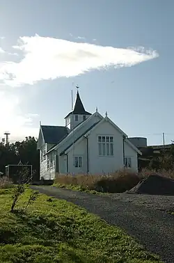 After the old church was moved, the cemetery on the old site remained in use until 1849 when it was closed. Many years later in 1925, a chapel was built on the site of the old church. There was no church here from 1755 until 1925. The chapel was built about 20 metres (66 ft) west of the old church site, just below the Sula Lighthouse. The new building is a wooden long church with a two-story extension on the west end which houses a meeting house on the second floor.[4]
