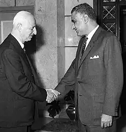 Nabulsi also decided to establish diplomatic relations with the Soviet Union and allowed the Communist Party to publish a weekly newspaper.[2] However, on 2 February 1957, the king warned against this in a speech directed to Nabulsi, saying "We want this country to be inaccessible to Communist propaganda and Bolshevik theories."[13] Heeding to Hussein's request, Nabulsi ordered the Communist Party organ to be banned.[2] Nabulsi was known to be an admirer of Nasser, and so called for Jordan to join an Arab federation with Egypt and Syria thereby reducing King Hussein to a figurehead.[14]