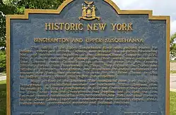 To celebrate the 150th anniversary of the Sullivan expedition in 1929, New York's state historian, Alexander Flick, successfully lobbied for the erection of thirty-five "Route of the Armies" monuments that marked the movements of Sullivan's and Clinton's forces in New York and Pennsylvania. The brass plaque mounted on each of the monoliths bears an inscription that perpetuates the false narrative that Sullivan "did conquer the Indians and forever stopped their depredations."[52] The inscription states that Sullivan and Clinton led "an expedition against the hostile Indian nations which checked the aggression of the English and Indians on the frontiers of New York and Pennsylvania, extending westward the dominion of the United States."[50] Similar markers were erected in Pennsylvania marking Sullivan's route from Easton to Tioga. A number of other monuments were erected by various local organizations while a plethora of cast-iron roadside markers were placed by the New York State Education Department.[50]